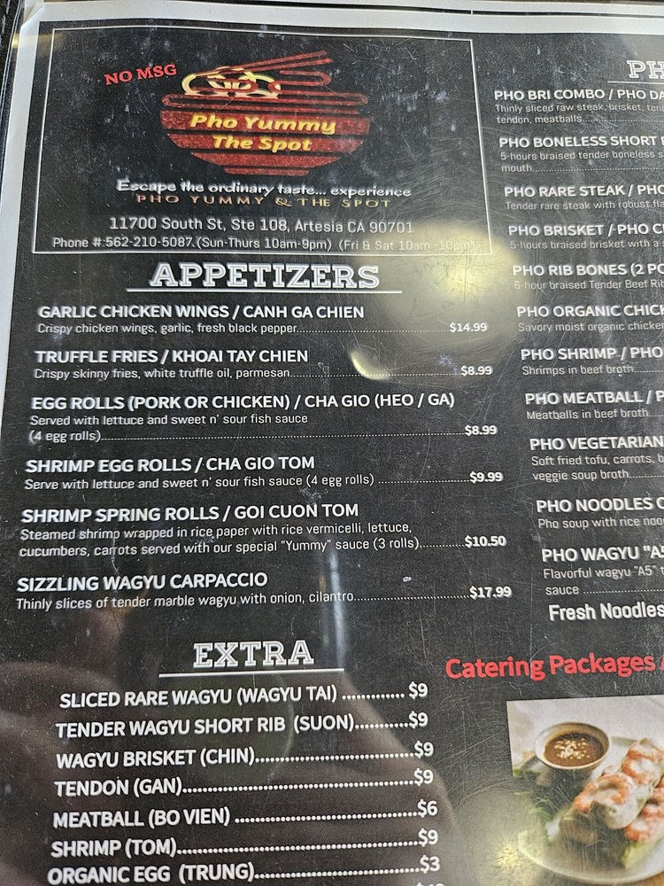 Pho Yummy, a Vietnamese restaurant, located in Artesia, CA, offers a trendy yet casual dining experience with outdoor seating and waiter service. Customers praise the excellent food quality and attentive service. The menu includes flavorful pho broth, fresh ingredients, and cane sugar sweetened drinks. The spacious and modern interior provides ample seating for groups. Specialties like Pho Brisket and Prime Wagyu showcase the rich and tender meat options. The owner's personal touch adds to the welcoming atmosphere, making each visit delightful. With a diverse customer base and positive reviews, Pho Yummy stands out as a solid choice for authentic Vietnamese cuisine.